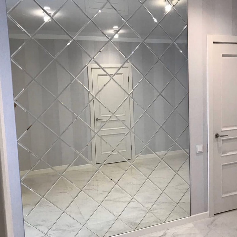Использована серебристая квадратная зеркальная плитка размером 18х18.